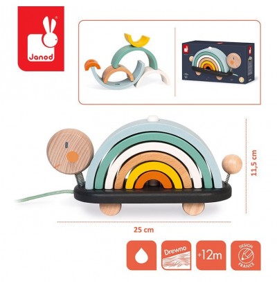 Drewniany żółwik do ciągnięcia z kolekcji Sweet Cocoon francuskiej marki JANOD będzie świetnym towarzyszem pierwszych kroków dziecka. Jest estetycznie wykonany, a jego skorupa składa się z 6 elementów - łuków o różnym promieniu, które nałożone na siebie tworzą tęczę, a osobno nadają się do tworzenia różnorodnych konstrukcji. Zabawka ma piękną, jakby „dorosłą” kolorystykę, m.in. jasnego drewna, szarości, niebieskiego, zielonego czy pomarańczu. Uroku dodaje żółwikowi głowa i okrągły ogonek na sprężynce, uśmiech i zaróżowione policzki. Można go ciągnąć na sznurku, a rozstaw kół zapewnia zabawce stabilność. Kółka są wykończone gumą, dzięki czemu nie rysują podłogi w domu.