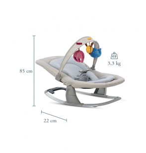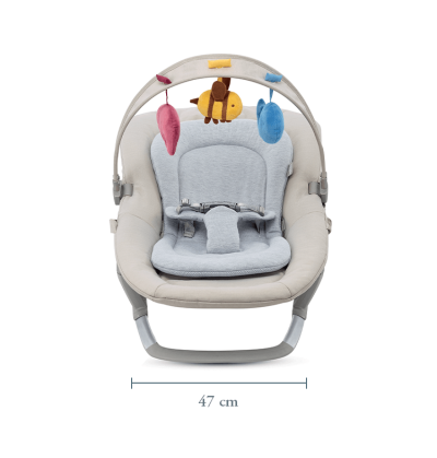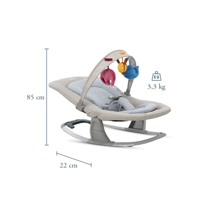 Leżaczek bujany jest lekki i praktyczny do przenoszenia dzięki bocznym uchwytom. Ponadto pałąk z zabawkami można ustawić w różnych pozycjach, dzięki czemu miękkie maskotki są w zasięgu ręki Twojego malucha.