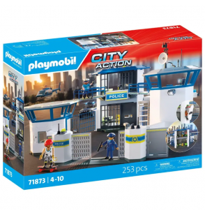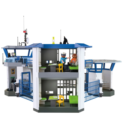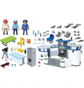 Figurki: 1 policjant, 1 policjantka, 1 przestępca; Akcesoria: 1 policyjne centrum dowodzenia, 1 biurko z komputerem i telefonem, 1 szafka na broń, 2 toalety z umywalką, 1 deska sedesowa, 1 biurko, 2 krzesła, 2 drewniane krzesła, 2 pary kajdanek, 2 pałki, 2 pistolety szybkostrzelne, 2 berety, 4 pistolety, 2 szczoteczki do zębów, 2 tuby na szczoteczki do zębów, 2 kubki, 2 łyżki, 2 talerze, 1 skaner odcisków palców, 2 folie do odcisków palców, 1 popiersie, 1 strój więźnia, 1 lampa błyskowa, 1 laptop, 1 dyktafon, 1 zegarek na rękę, 1 naszyjnik, 1 pudełko, 2 karty, 1 deskorolka, 1 radio, 4 zamki, 1 kask, 1 czapka policyjna, 1 czapka