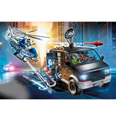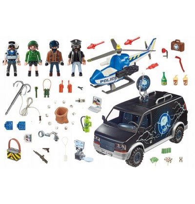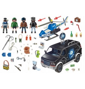 Czarna furgonetka ze wzorem czaszki to mobilne centrum kontroli włamywaczy z komputerem i laboratorium. Na ścianie półki jest miejsce na łomy i noże do szkła. Szef gangu dokładnie przestudiował plany muzeum i włamanie poszło idealnie. Teraz diamenty są sprawdzane pod lupą pod kątem czystości. Są to kamienie najwyższej jakości. Gdy włamywacze wznoszą toast za udany zamach, nad nimi słychać warkot helikoptera. Złodzieje ruszają szybko, ale pilot trzyma się ich na piętach. Hak z głośnym hukiem uderza w tył furgonetki i zatrzymuje pojazd. Złodzieje nie mogli długo cieszyć się zdobyczą. Zestaw do zabawy składa się z czterech figurek PLAYMOBIL, helikoptera z hakiem, furgonetki z anteną satelitarną, stanowiska komputerowego i wbudowanej półki na narzędzia włamywacze. Tylne drzwi furgonetki można otworzyć, dach zdejmowany, a tablice rejestracyjne można wymieniać.