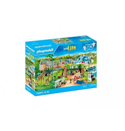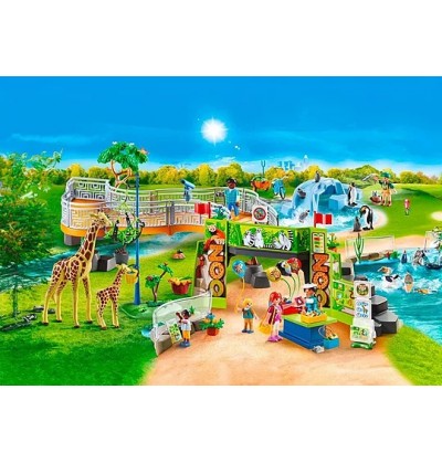 Figurki: 2 mężczyzn, 2 kobiety, 1 dziewczynka, 1 chłopiec Zwierzęta: 1 żyrafa, 1 mała żyrafa, 2 pingwiny, 4 małe pingwiny, 1 pelikan, 4 śledzie, 1 kret, 1 motyl, 1 mysz Akcesoria: 1 brama wejściowa ze schodami i platformą obserwacyjną z 2 flagami i tablicą informacyjną, 2 elementy ścieżki obserwacyjnej, 2 małe skały z pniem drzewa, 1 duża skała z drzewem, 2 elementy rozgraniczające fosę z roślinami wodnymi i szklaną ścianą, 1 teren zielony z drzewem i słupem z koszem na żywność dla żyraf, 1 duża skała pingwina ze zjeżdżalnią, 1 mała skała pingwina, 1 rower, 1 wózek ręczny, 3 dziecięce torby na ramię, 1 torebka, 1 aparat fotograficzny, 1 teleskop, 1 kasa, 1 stojak na balony z 4 balonami, 1 stojak na gazety, 1 tablica z zegarem, 4 mapy, 3 pudełka, 6 pocztówek, 3 opakowania na lód, 4 butelki, 4 pączki, 1 duże wiadro z wkładem na żywność, 1 duże wiadro, 2 małe drewniane wiadra, 1 wkład na wodę do drewnianego wiadra, 1 kosz, 1 wkład na jedzenie do kosza, 1 wiadro z kranem, 4 płaskie ciastka, 1 odchody żyrafy, 3 doniczki z roślinami, 1 łopata, 1 widły, 2 zielone elementy, 1 czapka, 1 czapka z daszkiem