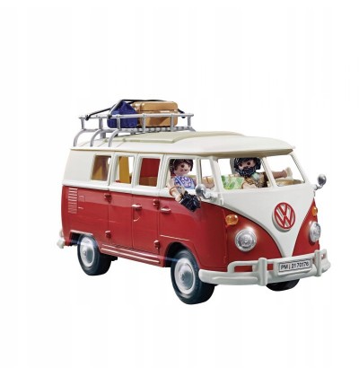 Volkswagen T1 Camping Bus uwielbiany przez pokolenia, od dziesięcioleci jest ikoną na drogach. Niezliczone rzesze poszukiwaczy przygód podróżowały nim po całym świecie. Wersja PLAYMOBIL klasycznego autobusu kempingowego posiada również wiele charakterystycznych detali, takich jak przednia część w kształcie litery V z czerwono-białym podziałem kolorów i czerwonym logo VW, zaokrąglony dach, przedzielona przednia szyba i zdejmowany bagażnik dachowy. Po zdjęciu dachu ukazuje się autentycznie zaprojektowane wnętrze. Stylowe T1 oferuje w środku składany stolik z dwoma siedzeniami, miejsce do zmywania naczyń oraz lodówkę. Kanapa dla dwóch figurek w typową kratę z lat 60-tych jest rozkładana. Boczne drzwi można otworzyć. W jednych drzwiach znajduje się regał na produkty spożywcze, a w drugich otwierany schowek z zintegrowanym lustrem. Volkswagen T1 Camping Bus: wsiadaj i ruszaj w drogę! - ciesz się wolnością! Zestaw zawiera dwie figurki, samochód kempingowy Volkswagen T1 ze zdejmowanym dachem i walizkami, bogate wyposażenie z rozkładanym stolikiem i tylnym siedzeniem, otwierane boczne drzwi z lustrem oraz miejscem na artykuły spożywcze oraz wiele innych akcesoriów.