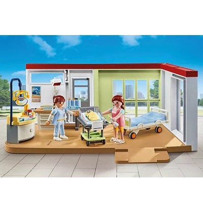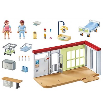 62-częściowy zestaw do zabawy zawiera 3 figurki PLAYMOBIL, element budynku, łóżko szpitalne, przewijak i wiele innych dodatków zachęcających do pomysłowego odgrywania ról.