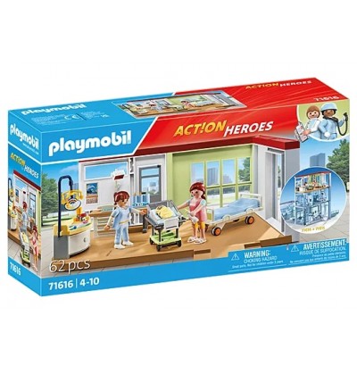 Maluchu - witaj na świecie! Na oddziale położniczym troskliwą opieką otoczona jest zarówno matka, jak i dziecko. Na tabliczce umieszczonej na łóżeczku można wpisać imię niemowlaka, po czym można sprawdzić jego wagę. Z przewijakiem, lampą, karuzelą, butelkami na mleko i wieloma innymi akcesoriami. Oddział położniczy PLAYMOBIL można połączyć z Nowoczesnym szpitalem (71615). Świat tematyczny PLAYMOBIL Action Heroes Ratownictwo oferuje dzieciom możliwość pozbycia się lęku związanego z wizytą u lekarza lub w szpitalu poprzez zabawę.