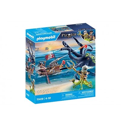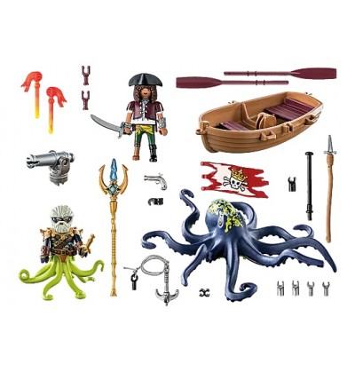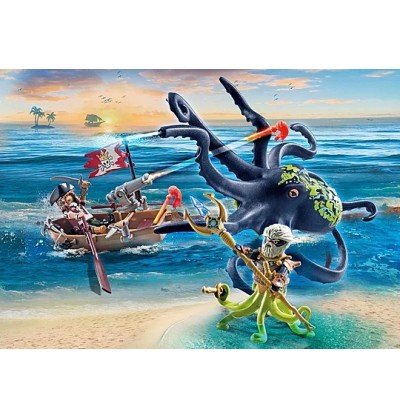 Gigantyczna ośmiornica wyposażona w funkcję rozpryskiwania wody. Piracka łódź unosi się na wodzie i ma miejsce na figurkę PLAYMOBIL.