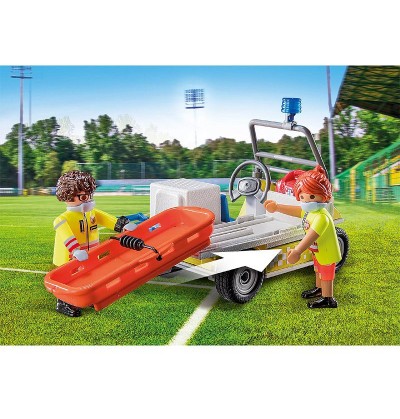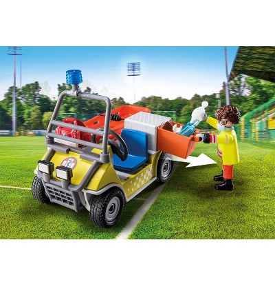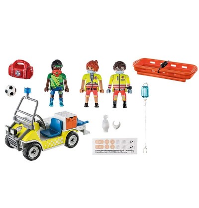 Playmobil 71204 Samochód ratunkowy. Wskocz do wózka ratunkowego i ruszaj na miejsce! Zwrotny wózek może błyskawicznie dotrzeć na miejsce wypadku, nawet w trudnym terenie. Tym razem na boisku do piłki nożnej doszło do sytuacji awaryjnej. Ekipa ratunkowa szybko podchodzi do poszkodowanego. Piłkarz został poważnie sfaulowany i nie można wykluczyć kontuzji szyi, więc najpierw zakłada się mu ortezę, aby go ustabilizować. Następnie ratownicy medyczni ostrożnie podnoszą zawodnika na nosze transportowe, a następnie na caddie. Szybko trafia do szpitala na dalsze dokładne badania. Zestaw zabawek zawiera 3 figurki PLAYMOBIL, wózek ratunkowy, nosze transportowe, opatrunek, zestaw infuzyjny i wiele innych dodatków do ekscytujących misji ratunkowych w pokoju dziecięcym. Pacjenci mogą być transportowani leżąc na noszach ratunkowych na caddie. Z dołączonymi etykietami gipsowymi, rany goją się w mgnieniu oka. Seria PLAYMOBIL City Life obejmuje nowoczesne pojazdy i realistyczne modele, dzięki którym dzieci mogą zanurzyć się w ekscytującej zabawie w odgrywanie ról.