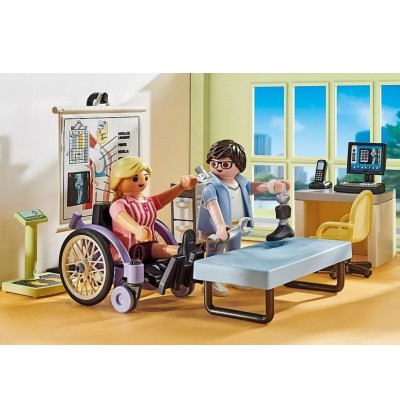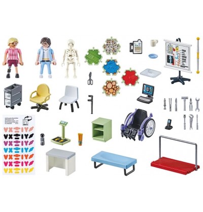 69-częściowy zestaw do zabawy zawiera potrzebne wyposażenie do zabawy w odgrywanie ról na oddziale ortopedii: stół zabiegowy, wagę, różne pomoce do chodzenia, a także dwie figurki PLAYMOBIL, wózek inwalidzki i wiele innych akcesoriów medycznych. Trzyczęściową protezę można przymocować do figurki i ponownie zdjąć.