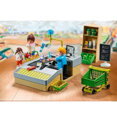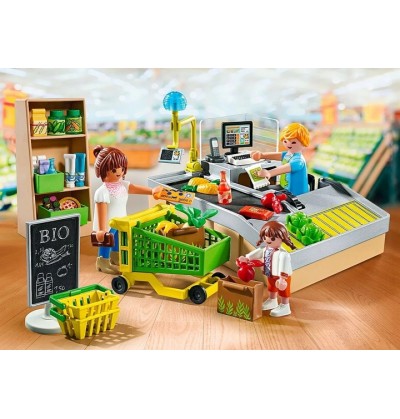 Zabawa podczas robienia zakupów: W ekologicznym supermarkecie PLAYMOBIL każdy znajdzie coś dla siebie! Zestaw zawiera kasę sklepową z taśmą, wózek na zakupy i wiele akcesoriów.