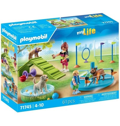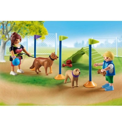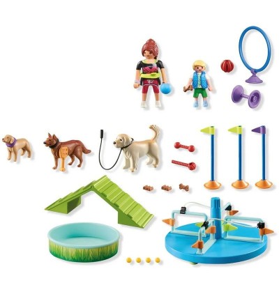Na placu zabaw dla psów PLAYMOBIL czeka wyjątkowa i szalona zabawa! Zakręć karuzelą, biegaj slalomem lub pluskaj się w basenie z piłeczkami — to niekończąca się zabawa dla psów i ich właścicieli. Stwórz trasę za pomocą silikonowych barierek lub ustaw rampę, aby przeżyć pełne energii przygody. Smycz można przymocować do paska figurki, aby bawić się bez użycia rąk.