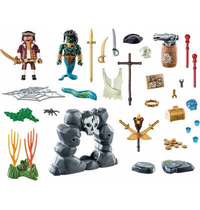Figurki: 1 pirat, 1 murena; Zwierzęta: 1 murena, 1 pająk; Akcesoria: 1 skała, 2 kamienie, 1 pajęczyna, 1 pnącze bluszczu, 1 beczka z armatą, 2 pociski, 1 drewniany krzyż, 2 czaszki, 1 piracki kapelusz, 1 peleryna, 1 skrzynia skarbów z monetami, 3 klejnoty, 1 korona, 1 mapa skarbów, 1 pochodnia z 2 szablami (dekoracja), 1 włócznia, 3 szable