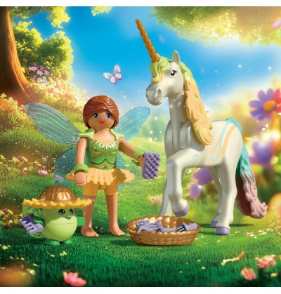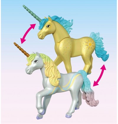 Poznaj jednorożca Tęczowy Kwiat i jego czarującą przyjaciółkę wróżkę! Tęczowy Kwiat jest znany ze swojego szczególnego połączenia z tęczą – jego olśniewająca obecność przynosi kolor i nadzieję królestwu jednorożców. Uroczą wróżkę wspiera jej miły towarzysz Joyling, który z radością i poświęceniem pomaga w opiece nad jednorożcem. Grzywa, ogon i róg jednorożca są wymienne. Umożliwia to tworzenie indywidualnych i unikalnych kreacji jednorożców z innymi jednorożcami w nowej serii jednorożców PLAYMOBIL!