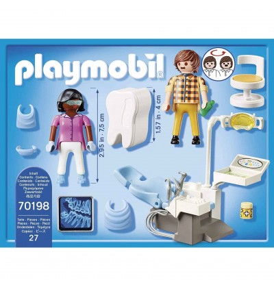 Dentysta 70198 to wspaniały komplet uzupełniający budynek szpitala 70190 (sprzedawany oddzielnie) lub niezależny zestaw do zabawy figurkami i akcesoriami Playmobil. Czas na wizytę u dentysty. Gabinet stomatologiczny wyposażony w specjalistyczny sprzęt. Zestaw zawiera figurkę stomatologa oraz figurkę pacjenta, którego wyraz twarzy można zmienić poprzez obrócenie jego głowy. W zestawie znajdziemy także fotel stomatologiczny, krzesło, pudełko do przechowywania ząbków mleczaków oraz pozostałe akcesoria tematyczne.