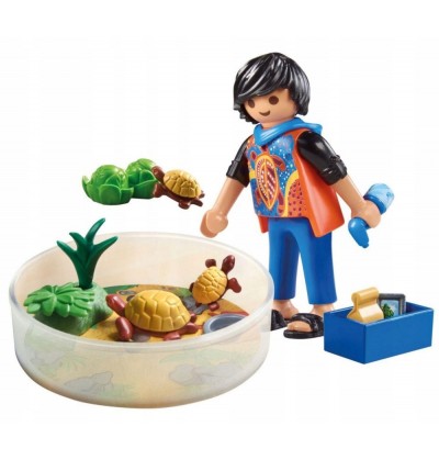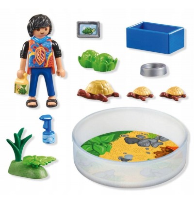 Opieka nad żółwikami jeszcze nigdy nie była tak fajna! Przestronne terrarium zostało specjalnie wyposażone dla sympatycznej rodzinki. Dorosły żółw z dwoma młodymi uwielbiają spędzać w nim czas! Mogą znaleźć tam miskę, bujne rośliny i mnóstwo innych akcesoriów. Najbardziej cieszą się z soczystej sałaty, mniam! Figurka odpowiedzialnego opiekuna Playmobil trzyma w dłoni preparat do czyszczenia skorupy. Żółwiki są najedzone i zaopiekowane!