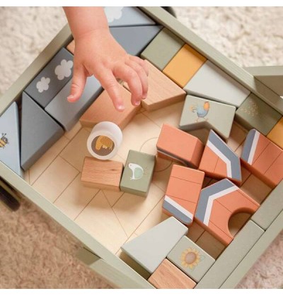 Kombinacja drewnianego wózka z klockami to interesujący sposób na łączenie zabawy z nauką i rozwijaniem umiejętności małych dzieci. Kółka zapewniają płynne poruszanie się wózka, jednocześnie dodając element trwałości i bezpieczeństwa. Klocki z pięknymi ilustracjami z kolekcji Little Farm nie tylko dostarczają rozrywki, ale również stymulują wyobraźnię i kreatywność dziecka.