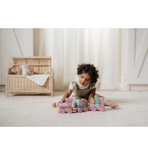 Pociąg Fairy Garden FSC od Little Dutch. Drewniany pociąg z klockami o różnych kształtach i kolorach oraz z pięknymi baśniowymi motywami z kolekcji Fairy Garden. Do trzech wagonów klocki można układać dowolnie wedle wyobraźni, przestawiać i łączyć. Pociąg składa się z 17 elementów i ma około 45 cm długości. Ta zabawka fantastycznie rozwija kreatywność i motorykę maluchów, umożliwia też poznanie pierwszych cyfr - 1,2 i 3. Stanowi świetny pomysł na prezent i doskonałe uzupełnienie dla pozostałych zabawek z kolekcji Fairy Garden od Little Dutch.