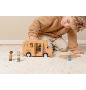 Drzwi i dach drewnianego autobusu szkolnego można otworzyć. Lalki pasują również do domku dla lalek i innych zestawów do zabawy, takich jak samolot i samochód z przyczepą kempingową.