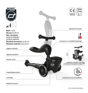 <div class="col-12 col-md-6"> <h2>Łatwa zmiana funkcji: Z jeździka z siedziskiem w hulajnogę</h2> <p><strong>Hulajnoga dla dzieci Highwaykick 1 Lifestyle</strong> to pojazd 2w1, który rośnie razem z dzieckiem. Dzięki innowacyjnej budowie można go w kilka sekund, bez użycia narzędzi, zamienić z jeździka z siedziskiem w stabilną 3 kołową hulajnogę balansową. Dwa przednie koła i system Safety-pad zapewniają maksymalną stabilność i bezpieczeństwo. Wysokość siedziska oraz kierownicy można regulować w trzech pozycjach, co sprawia, że ta <strong>hulajnoga dla dzieci</strong> będzie towarzyszyć maluchowi przez wiele lat.</p> </div> <div class="col-12 col-md-6"> <div class="col-12 col-md-6"> <h2>Wszystko co ważne, zawsze pod ręką</h2> <p><strong>Highwaykick 1 Lifestyle</strong> posiada na przodzie wbudowany schowek, który pozwala dziecku zabrać ze sobą najpotrzebniejsze rzeczy – zabawki, przekąski czy drobne skarby. Pojemnik jest zamykany, więc wszystko jest bezpiecznie przechowywane i dostępne podczas każdej przygody. Dzięki temu <strong>hulajnoga dziecięca Scoot&amp;Ride</strong> jest idealnym wyborem na każdą dziecięcą wyprawę.</p> </div> <div class="col-12 col-md-6"> <div class="longdescription-box longdescription-color03"> <div class="row"> <div class="col-12 col-md-12"> <h2>Hulajnoga balansowa - intuicyjne kierowanie</h2> <p><strong>Highwaykick 1 Lifestyle</strong> posiada system sterowania oparty na balansowaniu ciałem, co sprawia, że jazda na nim jest bardzo intuicyjna i łatwa do opanowania przez małych użytkowników. Dziecko kieruje hulajnogą, delikatnie przechylając ciało w lewo lub w prawo, co wspiera rozwój równowagi, koordynacji i umiejętności motorycznych. Hulajnoga z takim systemem to doskonały wybór dla maluchów, które zaczynają zdobywać pierwsze doświadczenia z mobilnością. Ten model jest idealny dla dzieci w wieku od 1. roku życia do 5 lat. Doskonale sprawdzi się jako <strong>hulajnoga dla 2 latka</strong> czy <strong>hulajnoga dla 3 latka</strong>.</p> </div> </div> </div> <div class="longdescription-box longdescription-color03"> <h2>Safety Pad - dodatkowe bezpieczeństwo dla małych podróżników</h2> <p><strong>Hulajnoga dla dzieci Highwaykick 1 Lifestyle</strong> oferuje dodatkowe zabezpieczenie w postaci podkładki safety pad, znajdującej się z przodu pojazdu i zapobiegającej jego niekontrolowanemu przewróceniu się. Jest to wyjątkowa funkcja, która zwiększa bezpieczeństwo, szczególnie na nierównych nawierzchniach.</p> </div> </div> </div> <p></p>