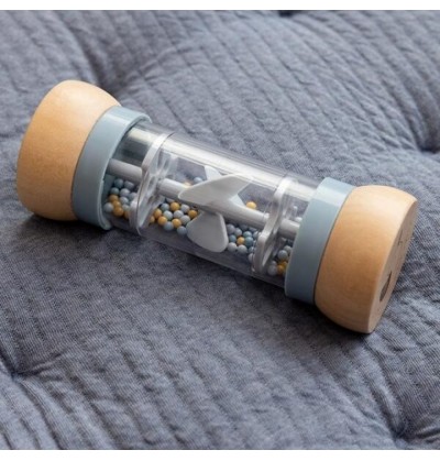 Grzechotka deszcz potrząśnij i nasłuchuj. Odwróć grzechotkę deszczową i posłuchaj kojących dźwięków kuleczek przemieszczających się z jednej strony deszczownicy na drugą. Grzechotka stymuluje rozwój sensoryczny malucha. Potrafi go zaciekawić na długi czas.