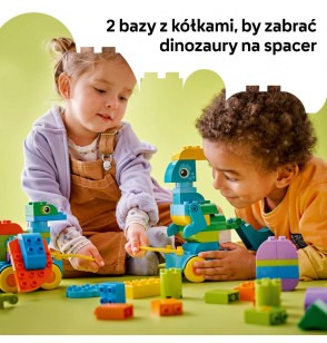 Zestaw LEGO® DUPLO® zawiera 108 klocków, z których można stworzyć trzy różne figurki: diplodoka, tyranozaura i triceratopsa lub stegozaura, pteranodona i parazaurolofa. Maluchy mogą dodać do swoich modeli ruchomą szyję, ruchomy ogon, trzepoczące skrzydła lub otwierające się pyszczki. Figurki można umieścić na podstawie z kółkami, więc zestaw sprawdzi się jako prezent dla dzieci, które uwielbiają pojazdy LEGO DUPLO.