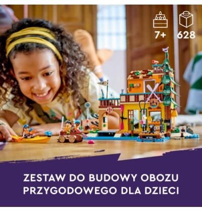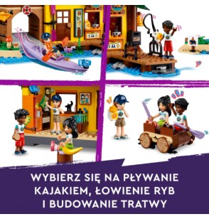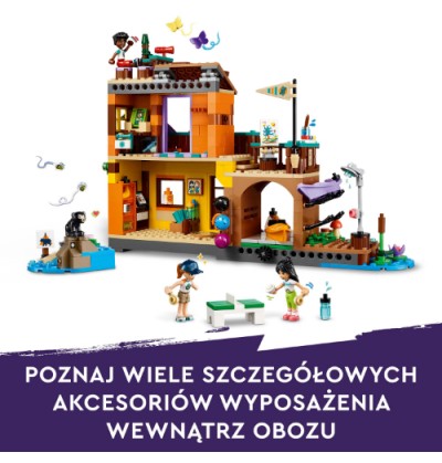 Ten zestaw LEGO Friends jest pełen akcesoriów umożliwiających opowiadanie historii. W obozie kempingowym jest sprzęt do wypożyczenia, lodówka z przekąskami, prysznic, apteczka, trofea i wiele innych elementów. Po dniu pełnym wrażeń pr zyjaciele mogą zrelaksować się w strefie spotkań lub zagrać w tenisa stołowego.