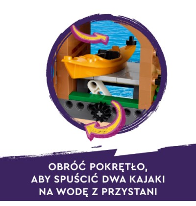Dzieci mogą odgrywać różne historie, zakładając postaciom kaski, kamizelki ratunkowe i wiosła, a następnie obracając pokrętło, aby spuścić na wodę dwa kajaki z przystani. Zestaw zawiera też funkcję, która pozwala dzieciom puszczaćkaczki z pomostu.