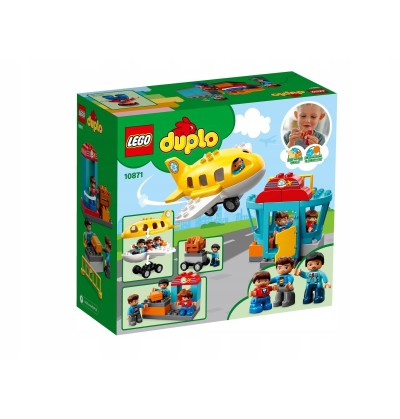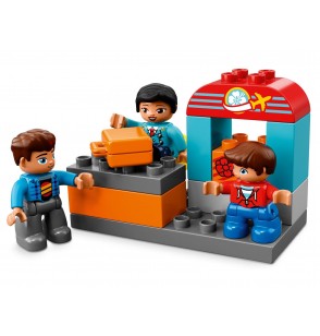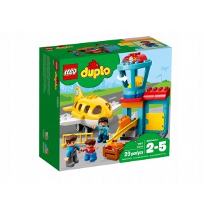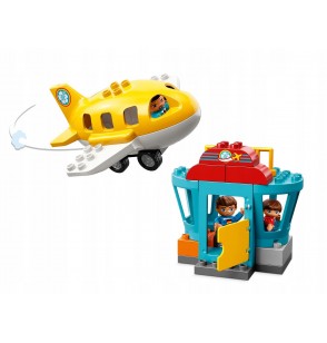 Ten zestaw LEGO DUPLO z lotniskiem ma wiele funkcji, które pobudzają wyobraźnię. Zawiera stanowisko kontroli bezpieczeństwa, przy którym dzieci mogą udawać, że skanują walizkę, a potem spuszczają ją specjalną rynną, wieżę kontroli lotów oraz ruchomy samolot, w którym zmieszczą się figurki misia, dziecka i pilota.