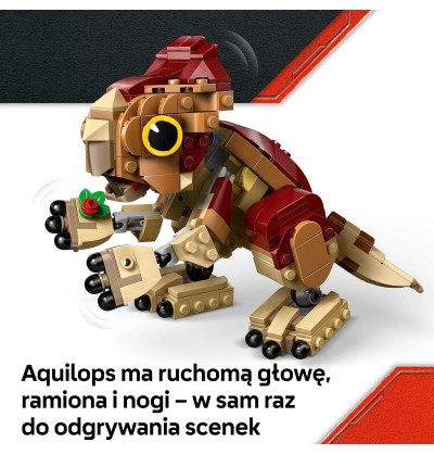 - Zestaw z małym dinozaurem — model małego aquilopsa inspirowany filmem Jurassic World Rebirth i roślina z kwiatami do zbudowania zachęcają do odgrywania ról i opowiadania historii
