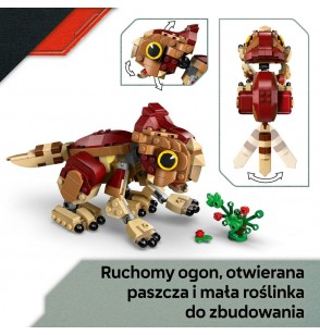 Niesamowite przygody czekają na dzieci i fanów w wieku od siedmiu lat, którzy chcą rozpocząć lub poszerzyć swoją kolekcję dinozaurów! Zestaw LEGO® Jurassic World Mały dinozaur Dolores: aquilops (76970) zawiera figurkę małego dinozaura aquilopsa oraz roślinę z kwiatami do zbudowania. Model małej Dolores ma ruchomą głowę, ramiona i nogi, które umożliwiają ustawianie jej w różnych pozach, a także ruchomy ogon i otwierany pyszczek, dzięki czemu można pokazać, jak cieszy się ze swojej roślinki. Po zabawie figurkę można ustawić na półce lub biurku jako ozdobę.