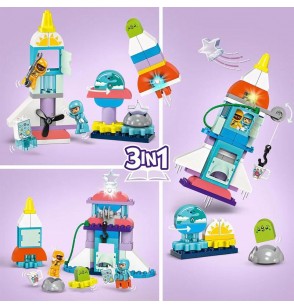 Dzięki temu zestawowi 3 w 1 zabawa nigdy się nie kończy. Zawiera on mnóstwo ciekawych klocków i elementów, które można przebudować w dwa inne zabawkowe pojazdy kosmiczne, bazę na planecie lub cokolwiek innego, co wymyślą dzieci! Dzięki obracającym się trybikom, śmigłu, wciągarce, drzwiom na zawiasach i świecącemu klockowi ta zabawka edukacyjna pomaga przedszkolakom rozwijać koordynację wzrokowo-ruchową.