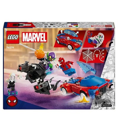 Spider-Man, Ghost-Spider i zvenomowany Zielony Goblin biorą udział w dynamicznych akcjach, korzystając z niesamowitych pojazdów, broni i akcesoriów. Samochód Spider-Mana ma dwa miotacze klocków z przodu, szybowiec Zielonego Goblina ma dwa miotacze klocków i bomby dyniowe, a Ghost-Spider jeździ na deskorolce z ręcznymi miotaczami sieci. Spider-Man huśta się na elastycznej „linie” i używa dużej sieci do łapania złoczyńców. Zdejmowane sekcje umożliwiają dostęp do wnętrza samochodu, które jest wystarczająco duże, aby pomieścić dwie minifigurki i deskorolkę. Dodatkową cyfrową zabawę zapewnia intuicyjna aplikacja LEGO Builder, w której można powiększać i obracać modele w 3D oraz śledzić swoje postępy.