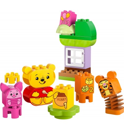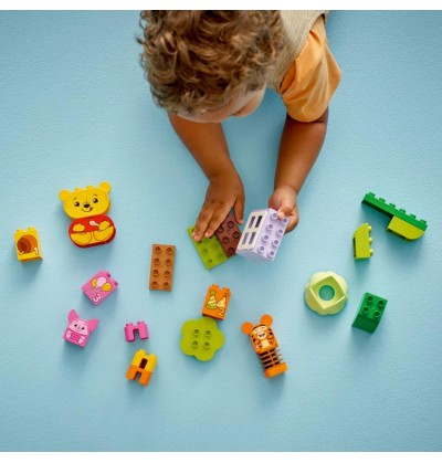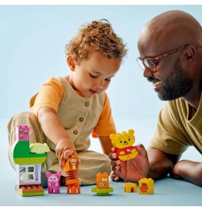 - Trzy postacie LEGO® DUPLO® do zbudowania — wzestawie są kultowe figurki LEGO® DUPLO Disney: Kubuś Puchatek, Tygrysek i Prosiaczek, a także prezenty i domek na drzewie, które inspirują do kreatywnej zabawy