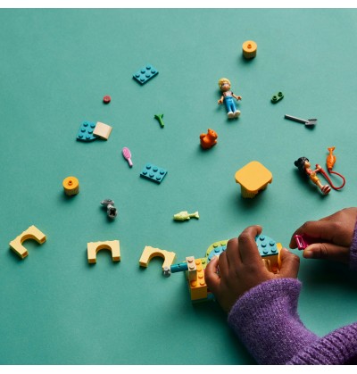 - Zestaw z placem zabaw dla kotów — zestaw LEGO® Friends Przygoda na kocim placu zabaw dla dzieci w wieku od pięciu lat zawiera dwie minilaleczki, dwie figurki kotów i mnóstwo akcesoriów do pielęgnacji zwierząt