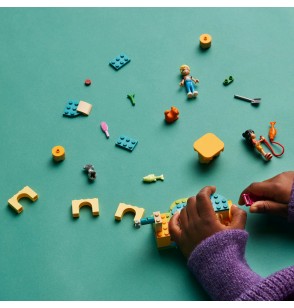- Mnóstwo akcesoriów — w zestawie LEGO® znajdziesz jedzenie i wodę, kuwetę, w której po przekręceniu dźwigni pojawia się kupa, szczotkę, szufelkę do kuwety i zabawkową rybkę