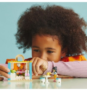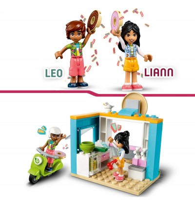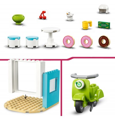 - Z dwoma minilaleczkami – zestaw zawiera postacie LEGO® Friends, Liann i Leo, okienko do obsługi i akcesoria, w tym skuter, ptaka, pączki, sok, pieniądze, stół i dwa krzesła