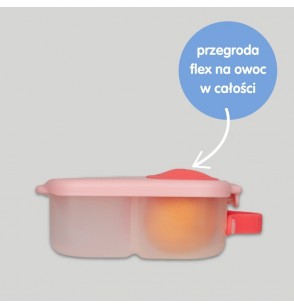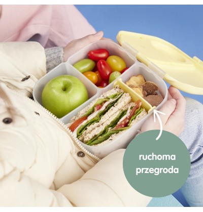 Małe pudełko na lunch dla dzieci do szkoły umożliwia bezpieczny transport przekąsek o półpłynnej konsystencji, takich jak jogurt lub sałatka, dwie przegródki w mini lunchboxie wyposażono w szczelną silikonową uszczelkę. Jedna z nich pozwala na zamknięcie w pudełku np. całego jabłka lub nektarynki. Uszczelka wykonana została z bezpiecznego silikonu i jest zdejmowana, więc można ją dokładnie wymyć i osuszyć. W lunchboxie zaprojektowano również nieco większą przegródkę, którą dzięki wyjmowanemu elementowi, można dostosować do własnych potrzeb.