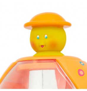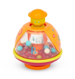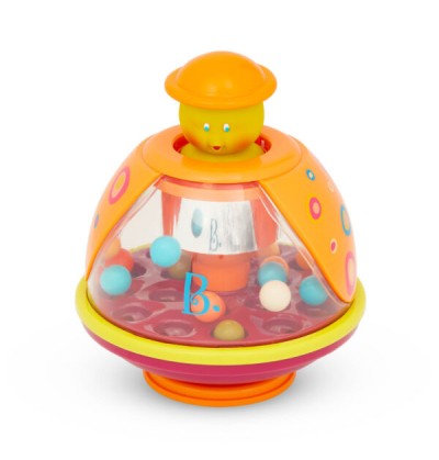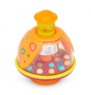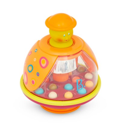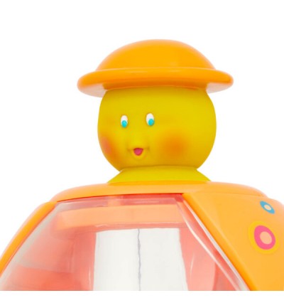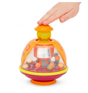 Główka – makówka. Bączek inny niż wszystkie. Naciśnięcie wesołego ludzika w kapeluszu wywołuje szalony taniec kolorowych kuleczek. Skaczące kuleczki przyciągają uwagę maluszka, a ciągłe wprawianie ich na nowo w ruch sprawia wiele frajdy.