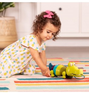 Uroczy krokodyl do ciągnięcia na sznurku. Idealny pomysł na pierwszego pupila. Zabawka sprzyja rozwojowi dużej motoryki, uczy także zależności przyczyna-skutek. Kółka wyposażone w gumowe otoczki. Otwierana paszcza i zabawnie wywracające się oczy uatrakcyjniają zabawę.